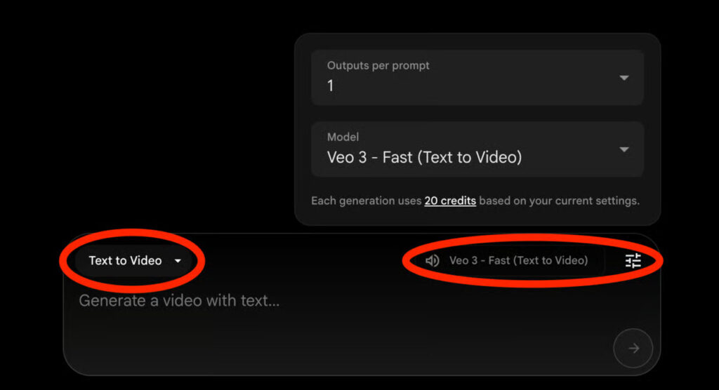 5. You’ll then be given the prompt box – change the settings to “Text to Video” and change the settings to “Veo3 – Fast (Text to Video)” and select 1 “Outputs per prompt”